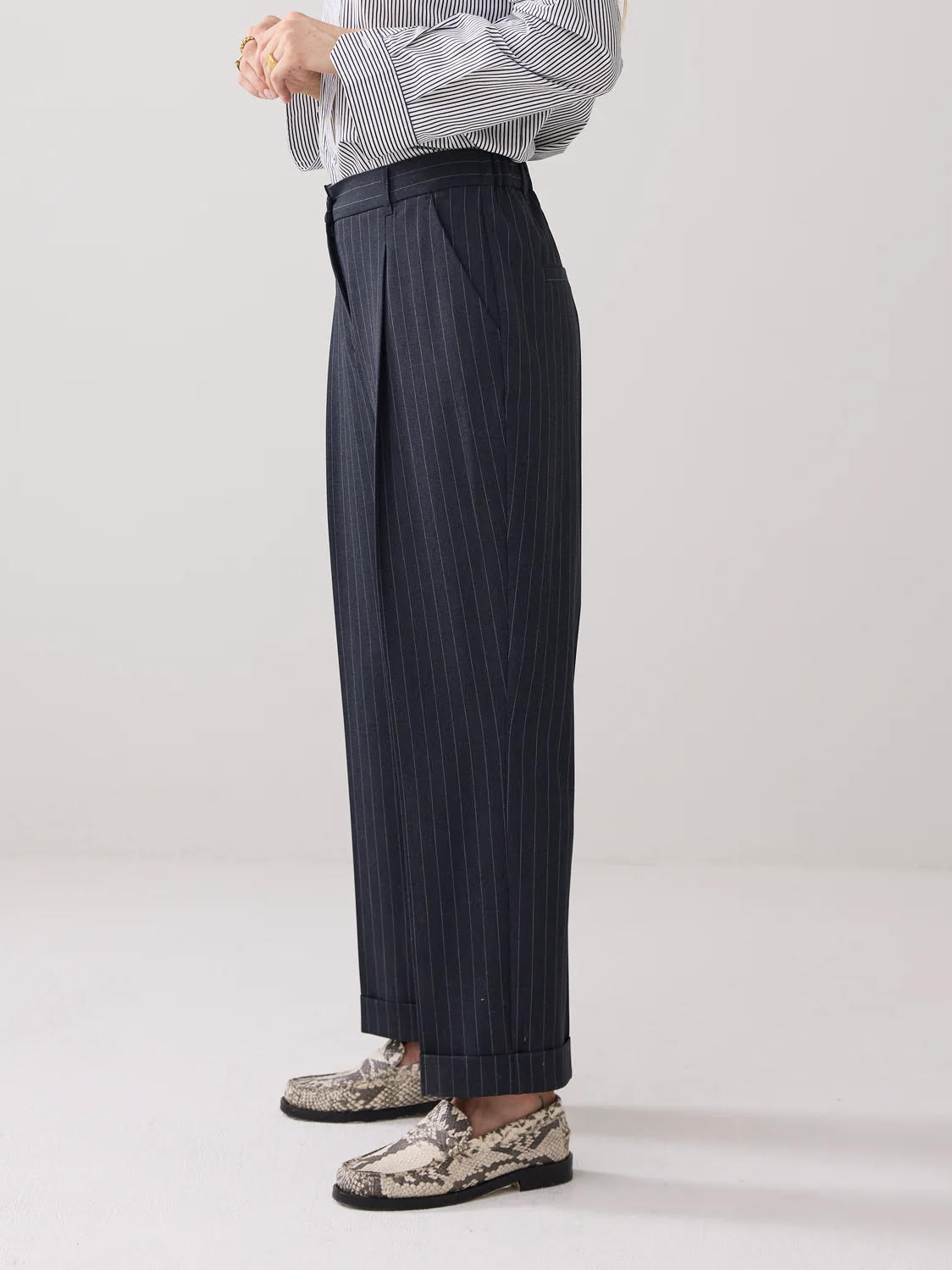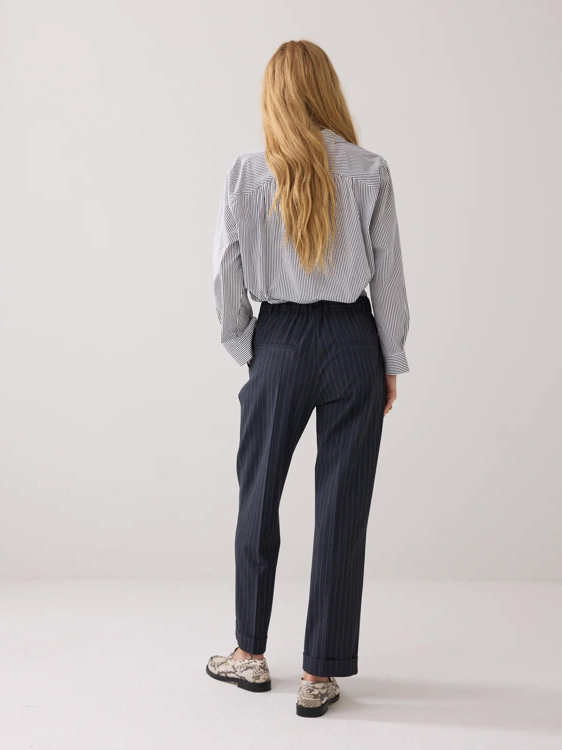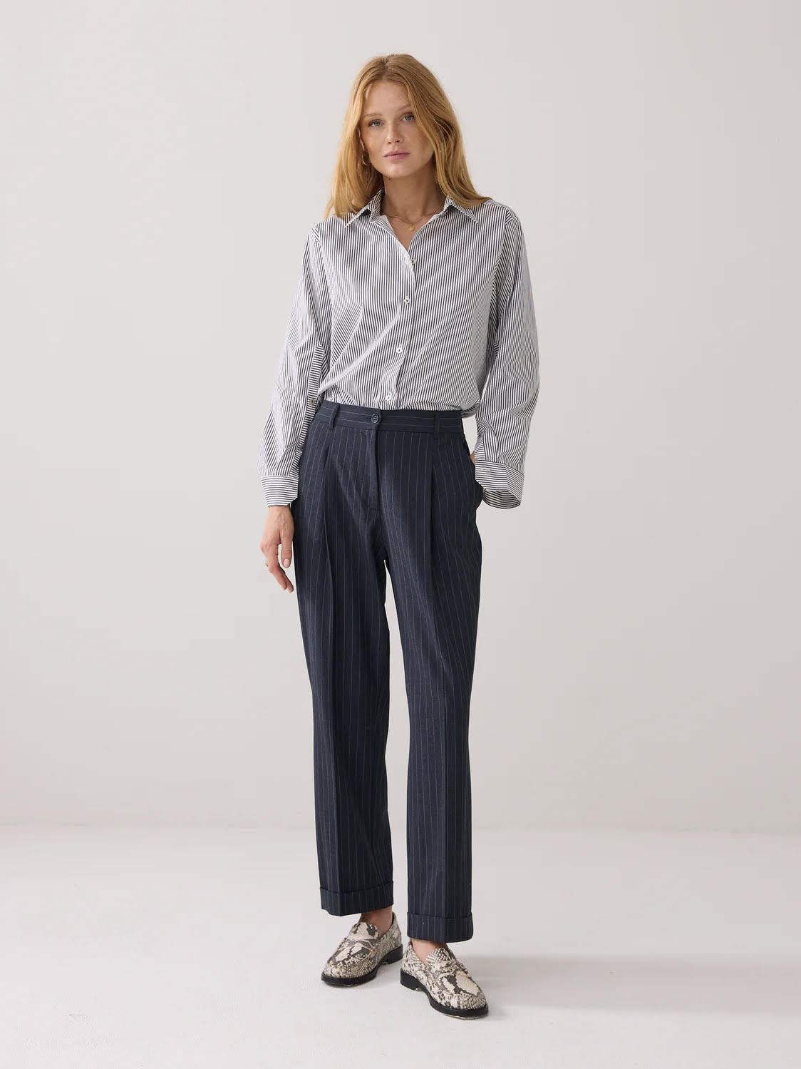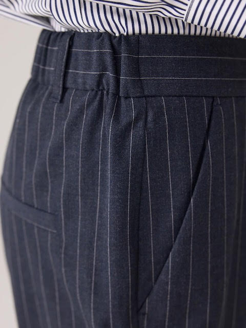 מכנסיים מבית המותג SUMMUM באורך קרסול בגזרה ישרה ומדוייקת, עשויים מבד קליל ונעים עם דוגמת פסים דקה בגוון אפור בהיר . גזרת הטיילורינג הגברית משלבת קפלים עדינים בקדמת המותן, חגורה מותן אלסטית וכיסים צידיים שמעניקים לכל הלוק ניחוח אלגנטי עם קריצה מחוייטת.