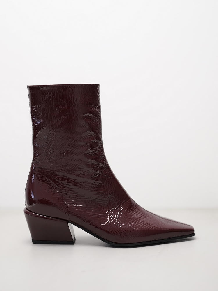מגפוני עור לק מבריקים בגוון בורדו עמוק עם חרטום מחודד ועקב גיאומטרי.