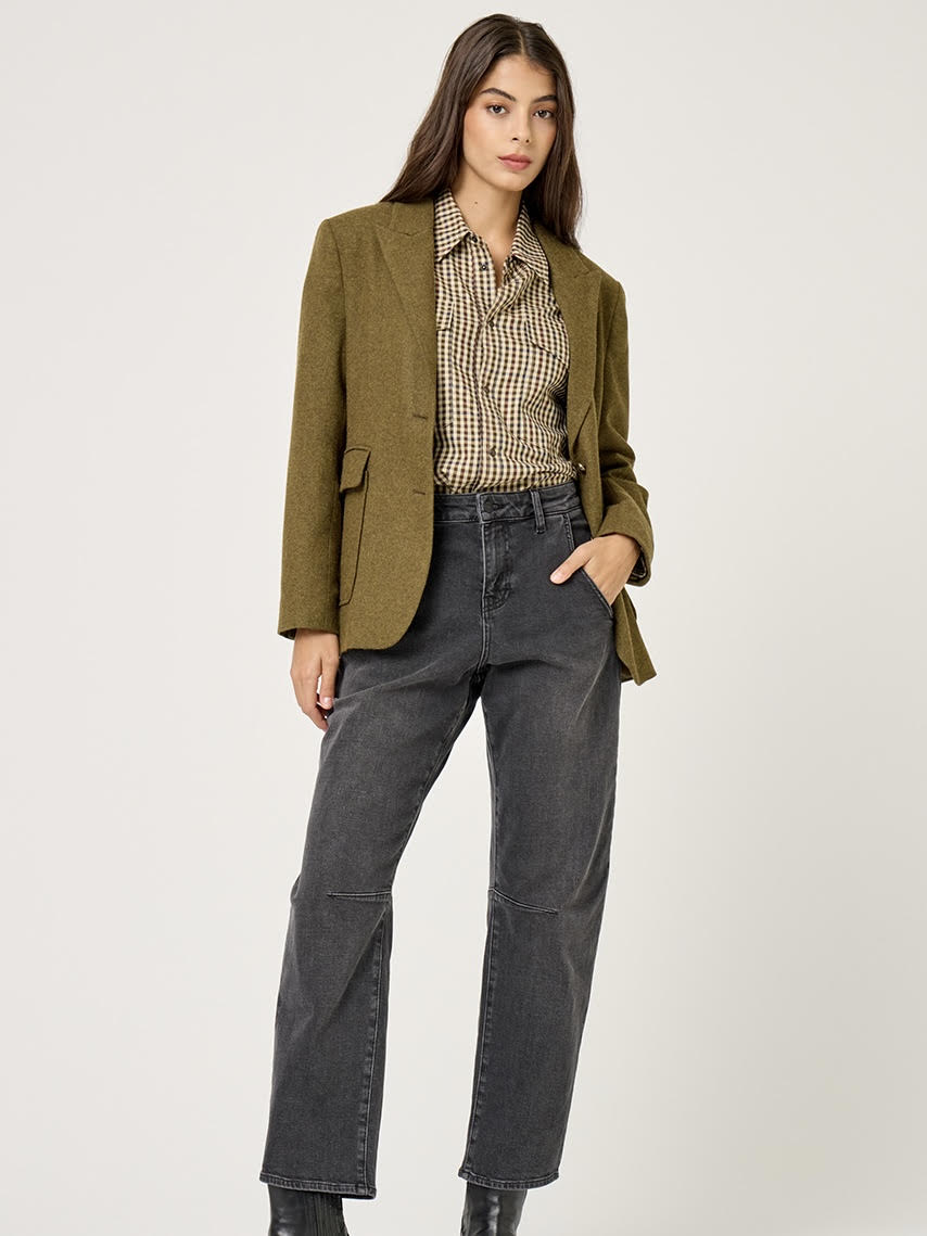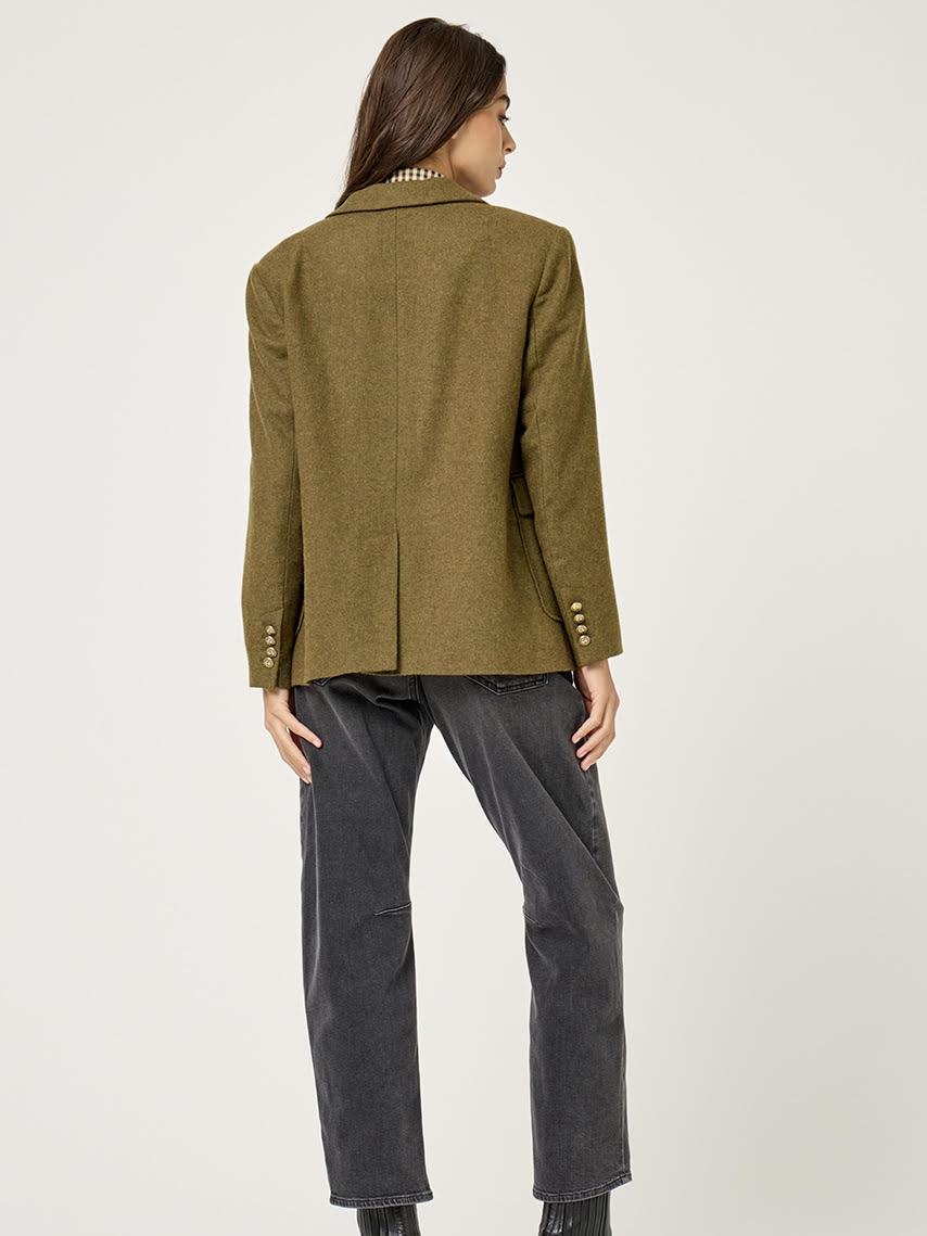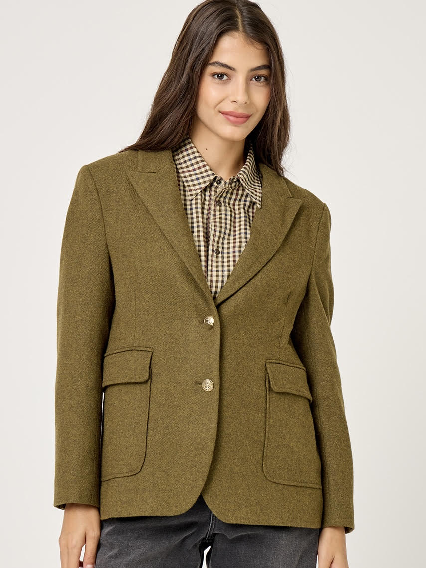 בלייזר מחויט עשוי צמר רך ונעים בגוון חאקי זית עם גזירת שני כפתורי רכיסה במרכז ודשים רחבים המעניקים מראה מתוחכם ונקי.