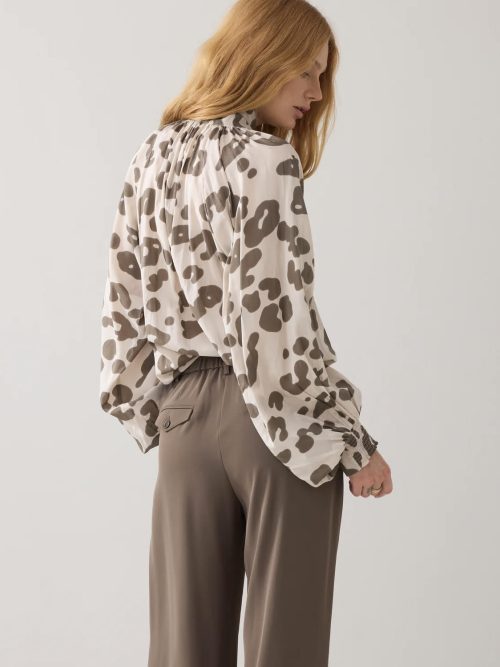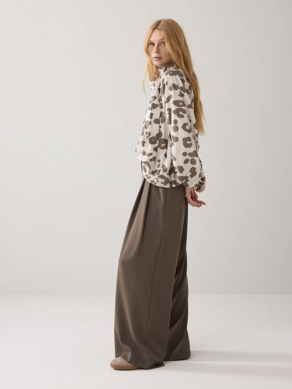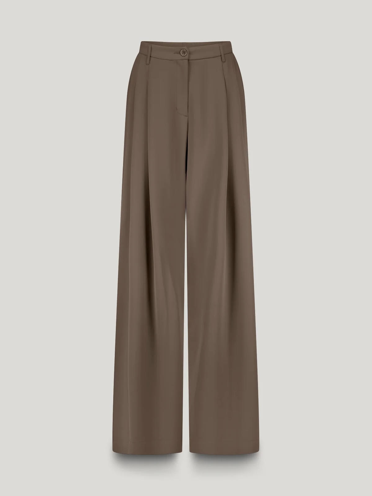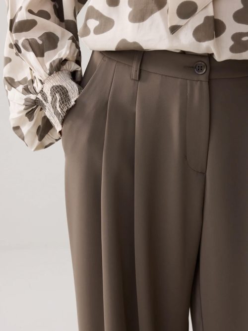 מכנסיים מחוייטים בגזרה גבוהה רחבה ומעודנת, למכנסיים כפתור קידמי וחגורת מותן אלסטיית מאחור המעניקים לו נוחות מקסימלית ושיק מטורף.