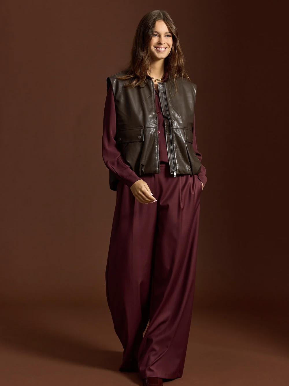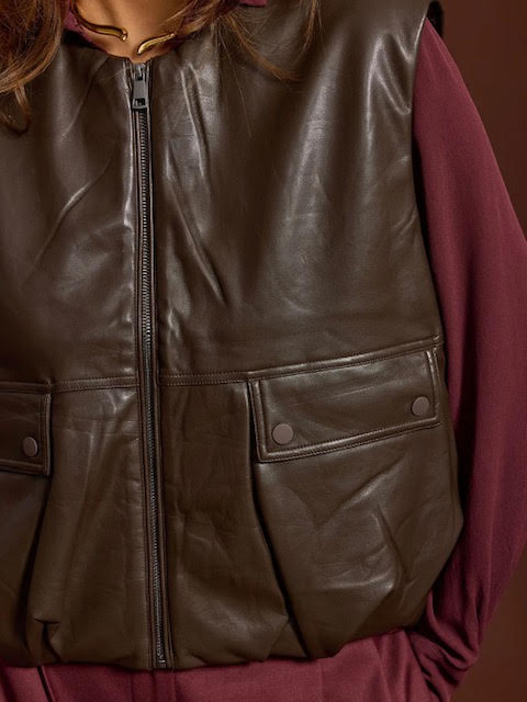 ווסט בגזרת אוברסייז עשוי דמוי עור רך ונעים בגוון חום שוקולד. כולל רוכסן קידמי, כיסים עם כפתורים ולוק נונשלנטי עם נוכחות.