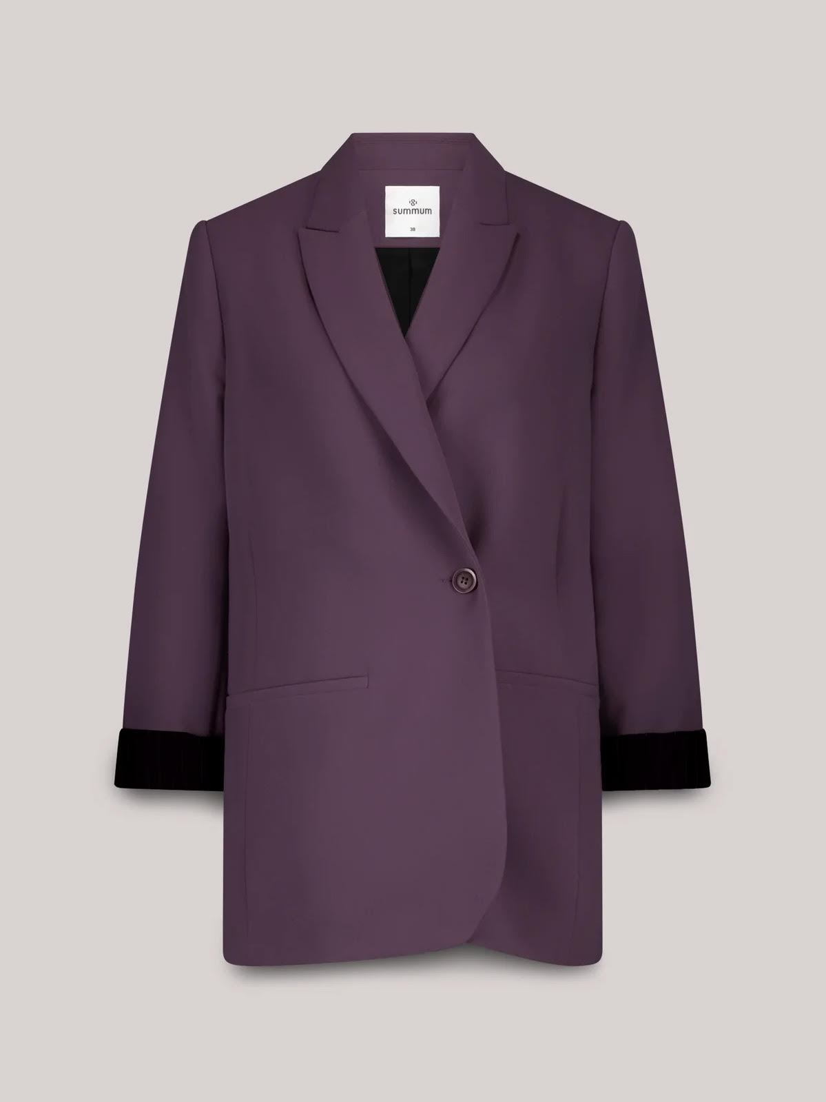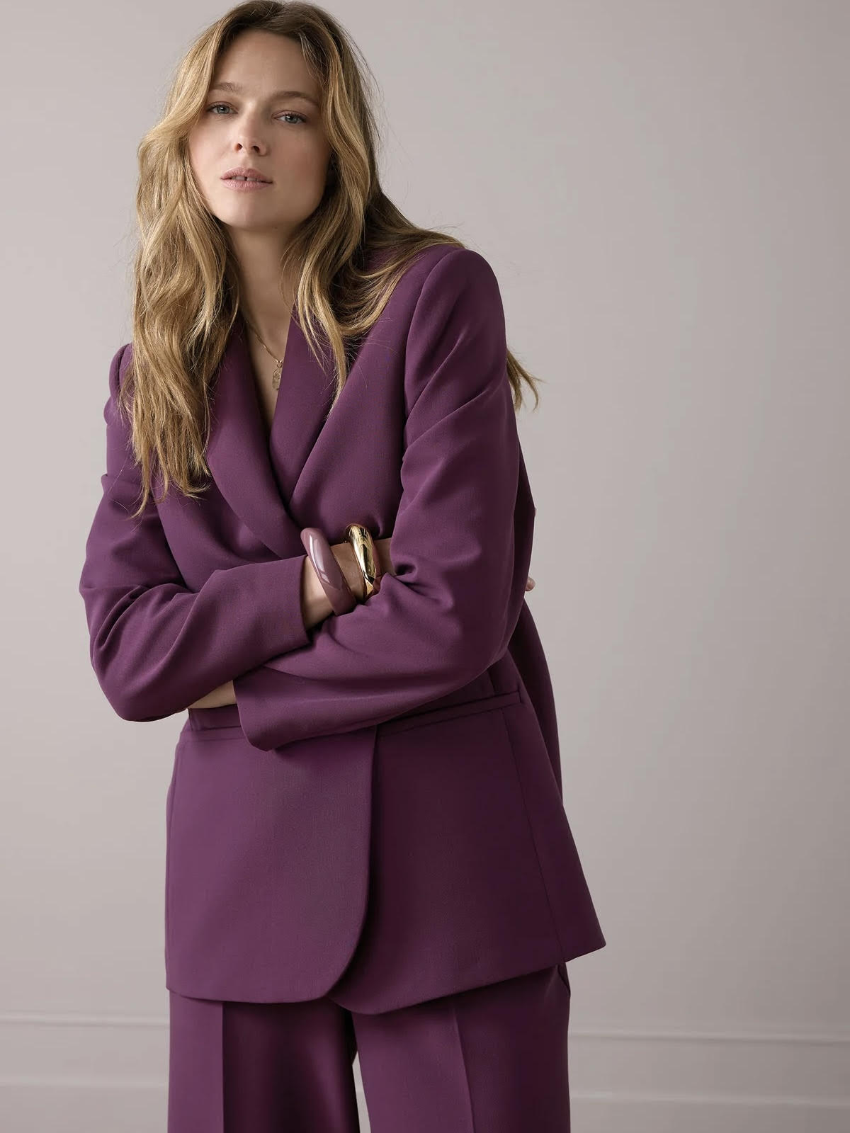 ג'קט אלגנטי ומדויק בגזרה מחויטת אך רכה המשלב בין קלאסיות לנשיות מודרנית. עשוי מבד איכותי עם טקסטורה חלקה ונפילה מושלמת בגוון סגול עמוק ומרשים שמוסיף נוכחות להופעה.