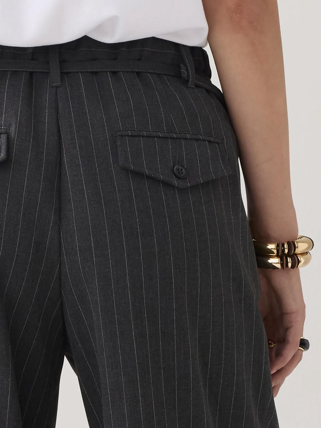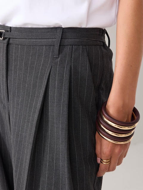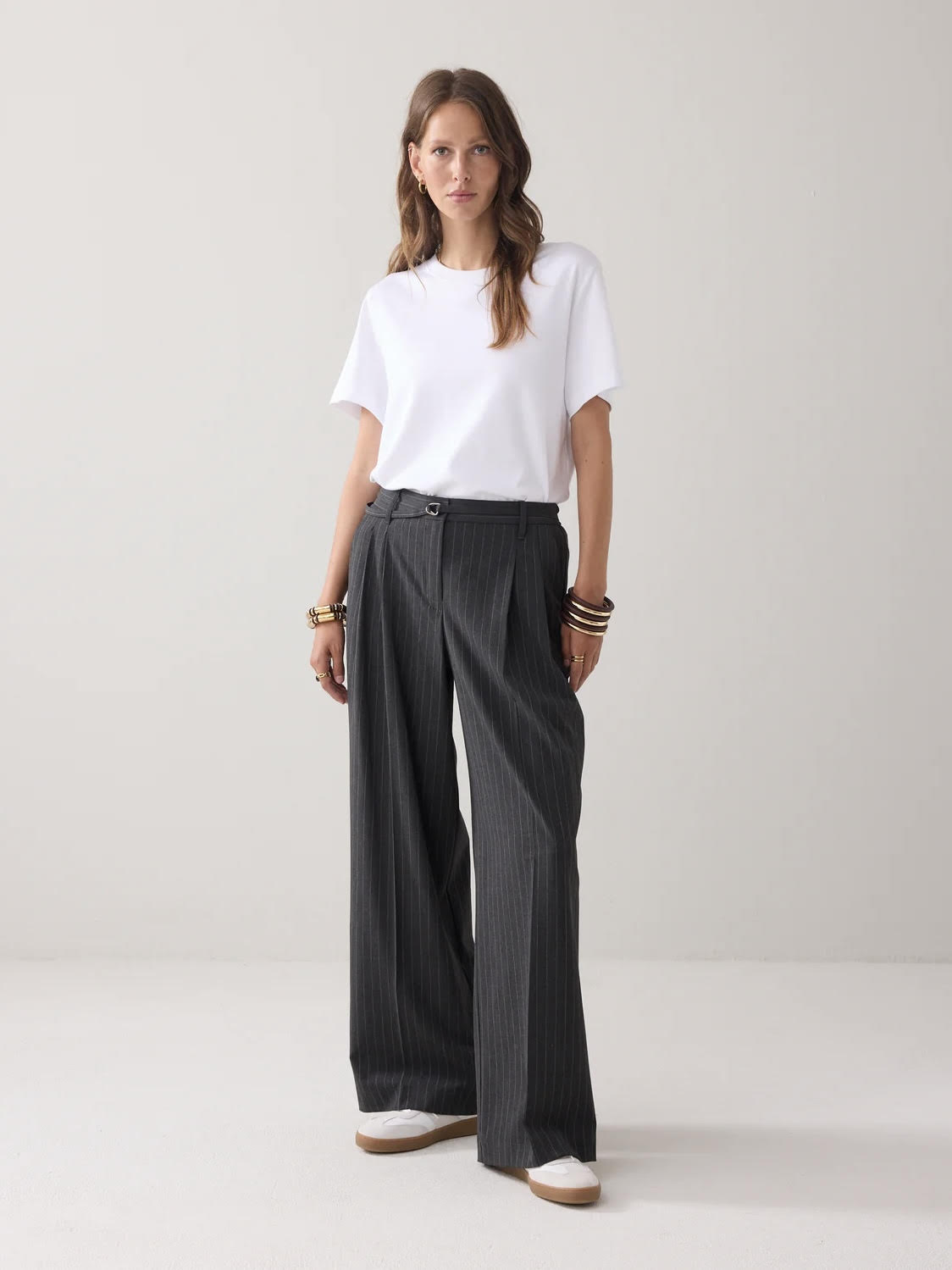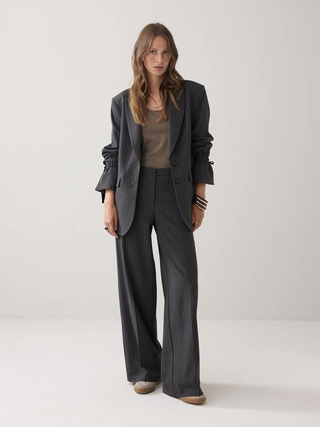 מכנסיים מבית המותג ההולנדי SUMMUM בגזרה רחבה ונינוחה בגוון אפור עמוק עם דוגמת פסים דקים בצבע אפור בהיר.