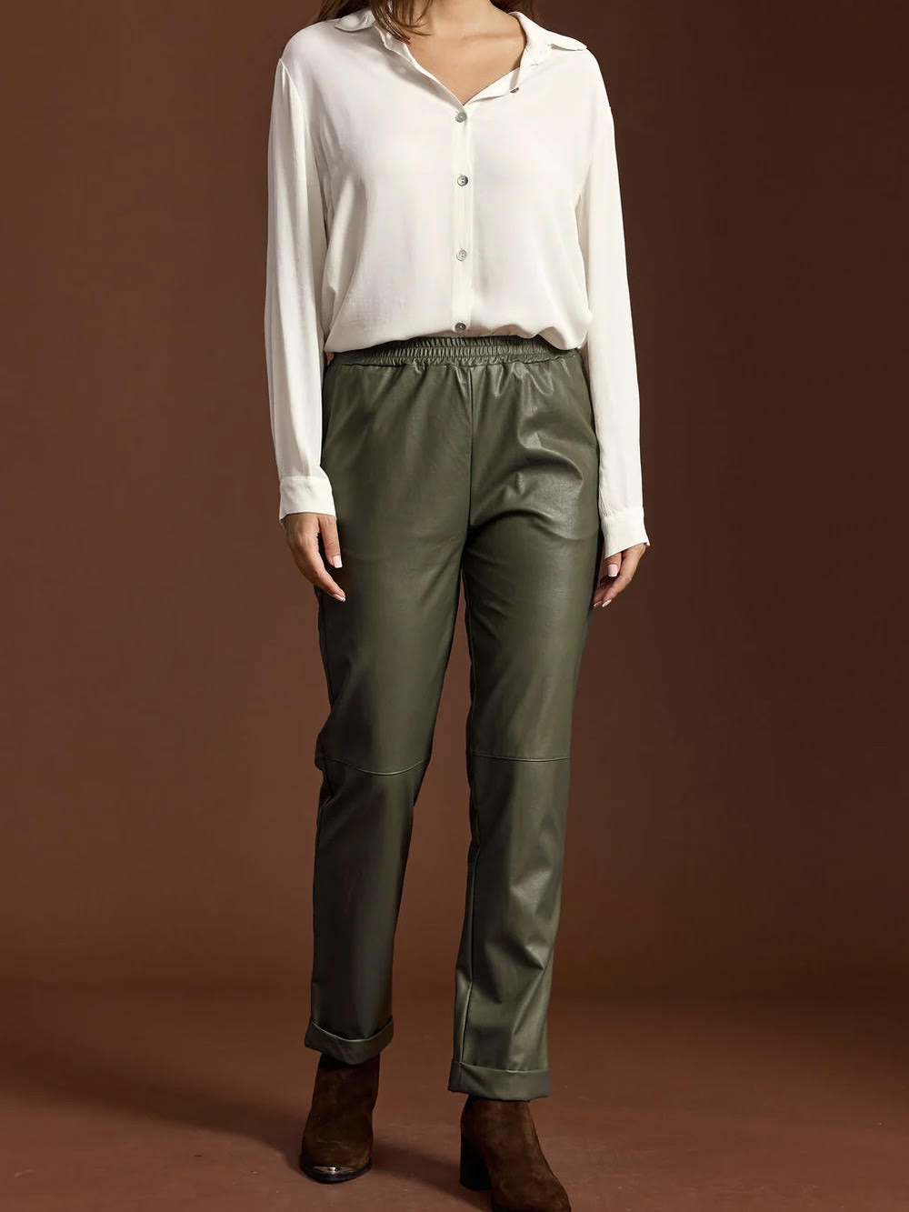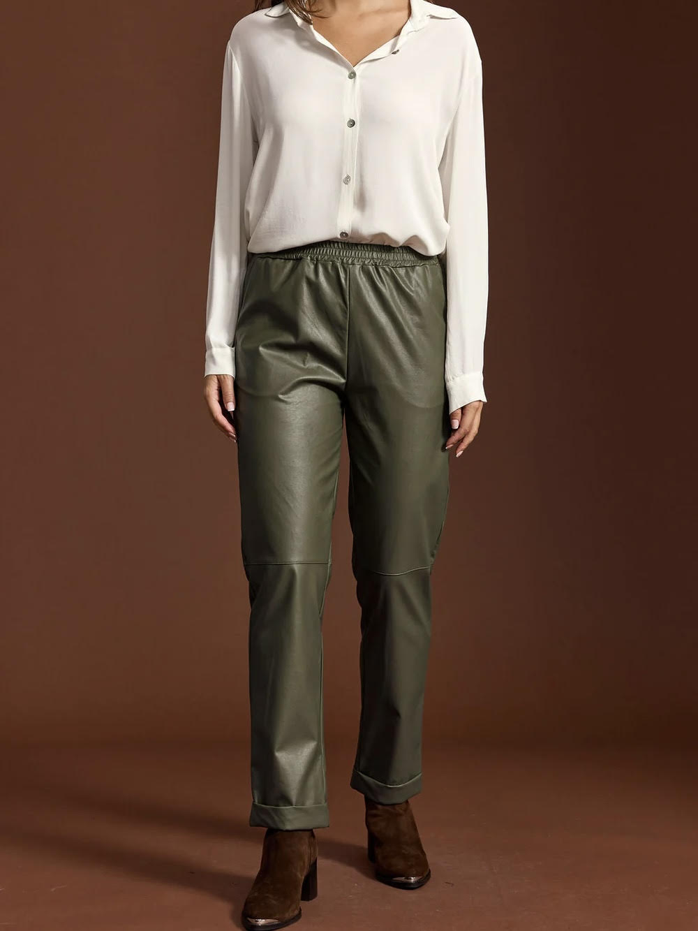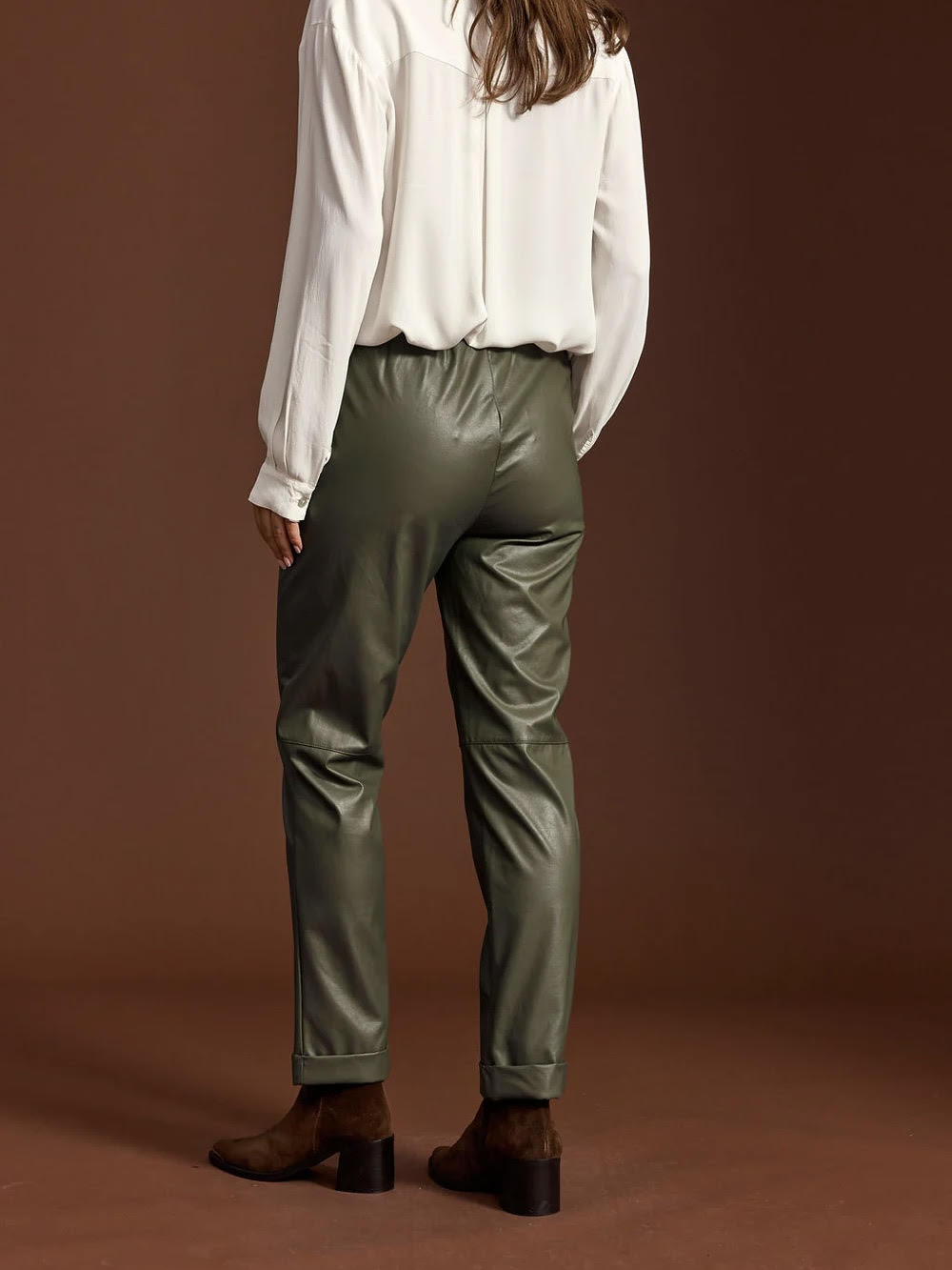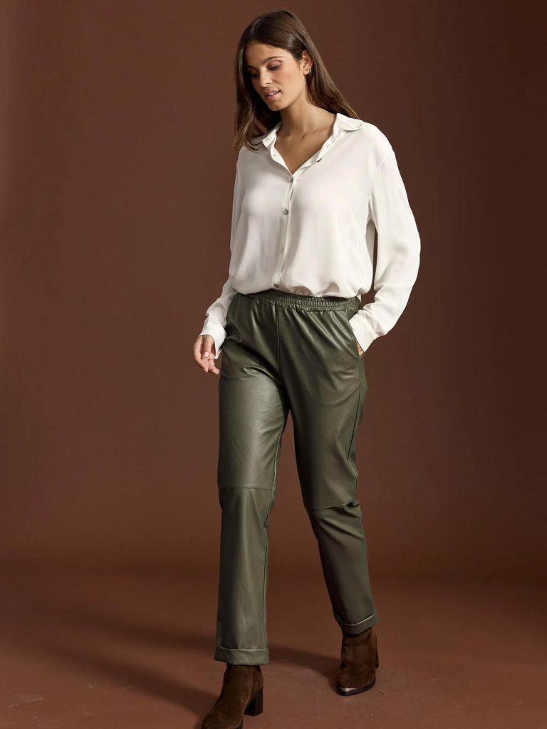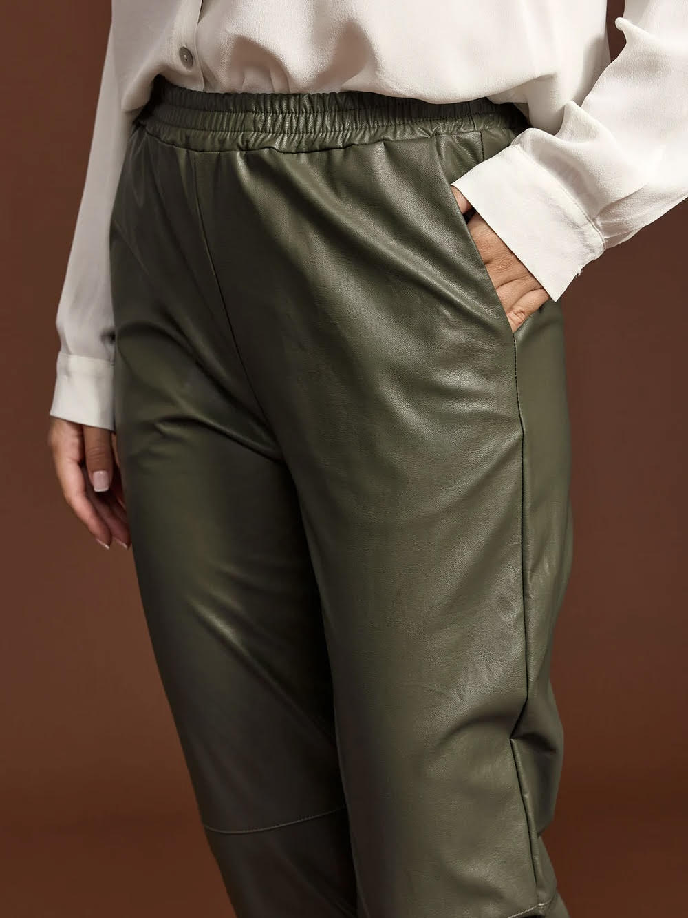 מכנסיים עשויים מבד דמוי עור רך בגוון ירוק זית עם גזרה ישרה ונינוחה. למכנסיים חוגרת מותן אלסטית לנוחות מקסימלית ותחושת חופש בתנועה עם שני כיסי צד ומכפלת בסיומת המכנסיים.