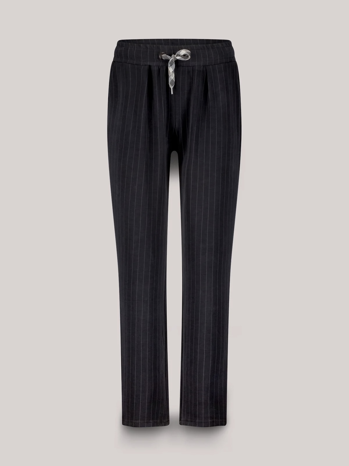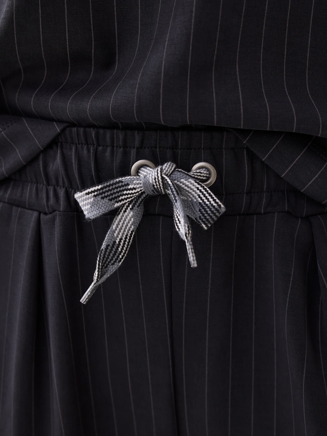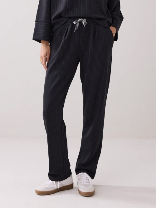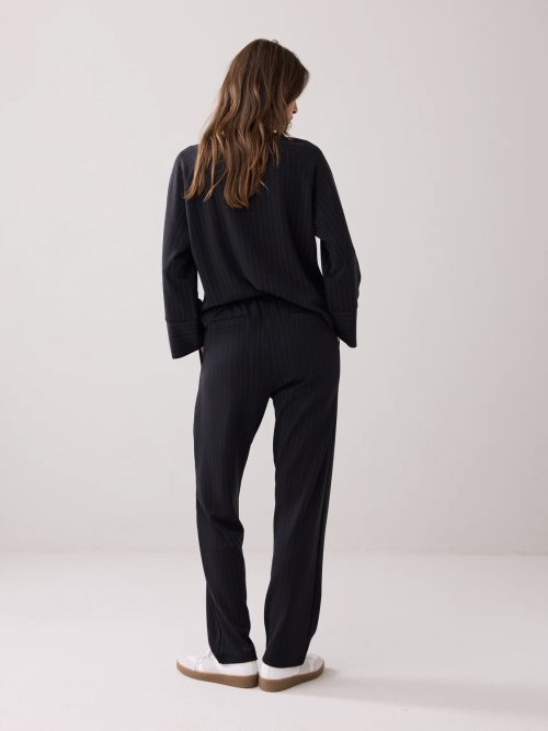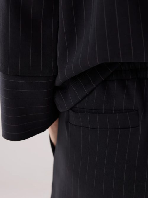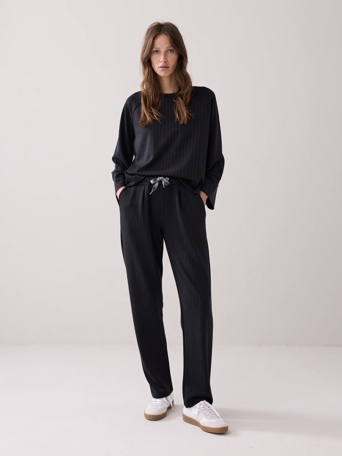 מכנסיים שחורים עם פס דק בצבע אפור בעלת גזרה רפויה למראה קז'ואל מתוחכם.