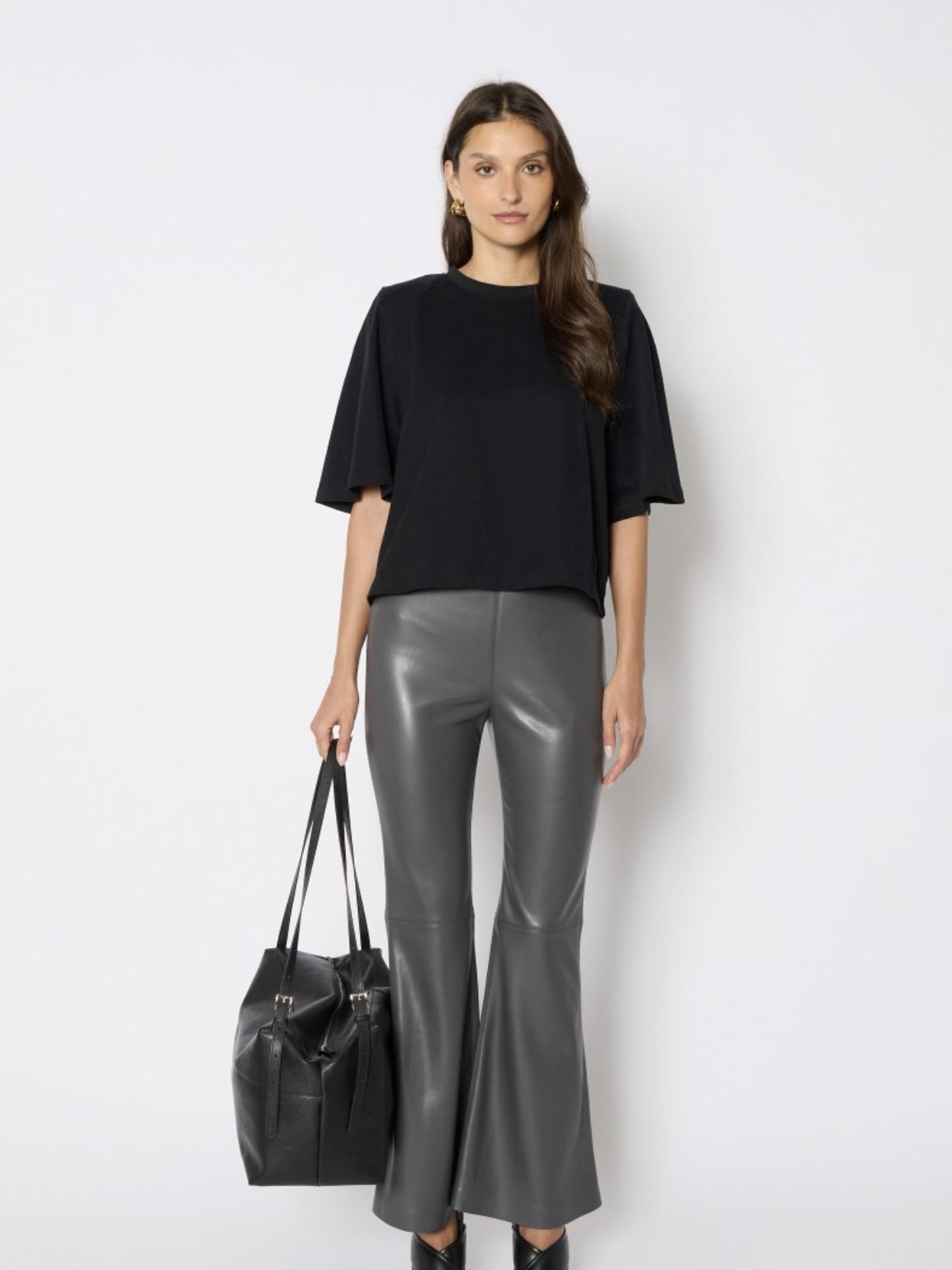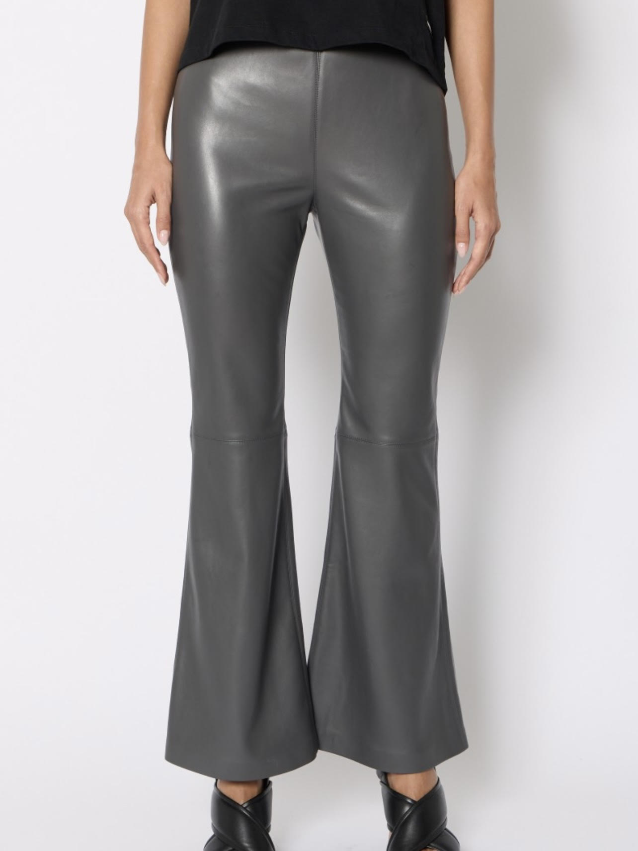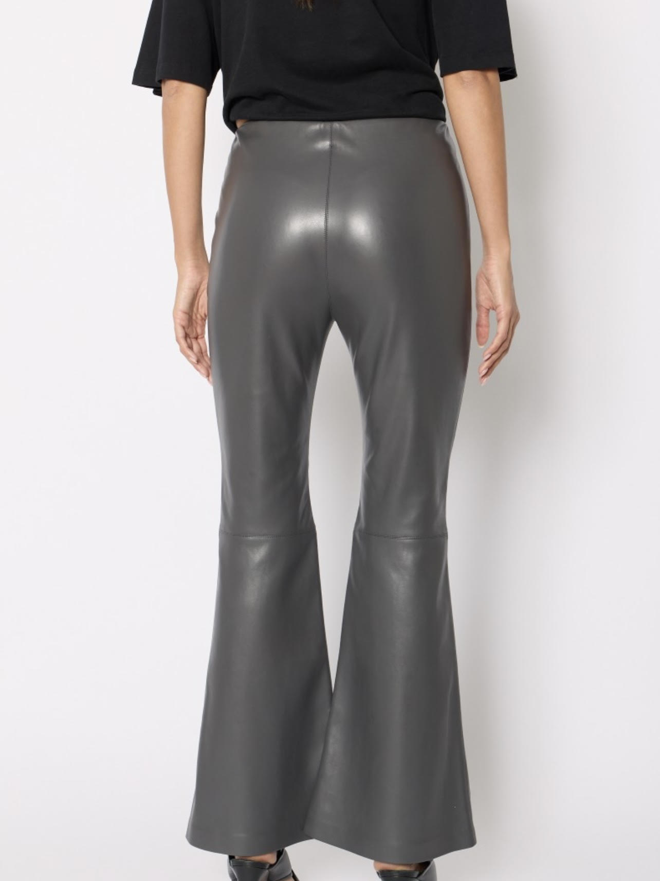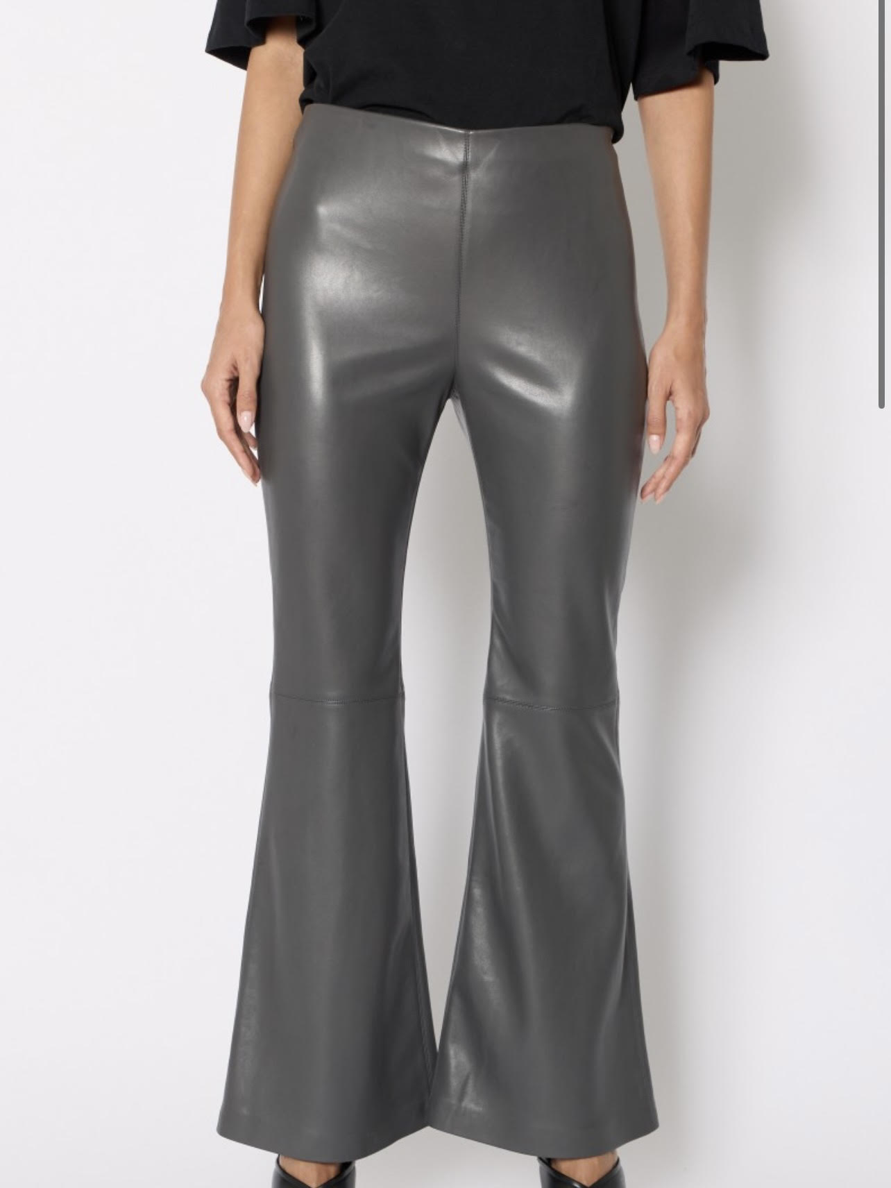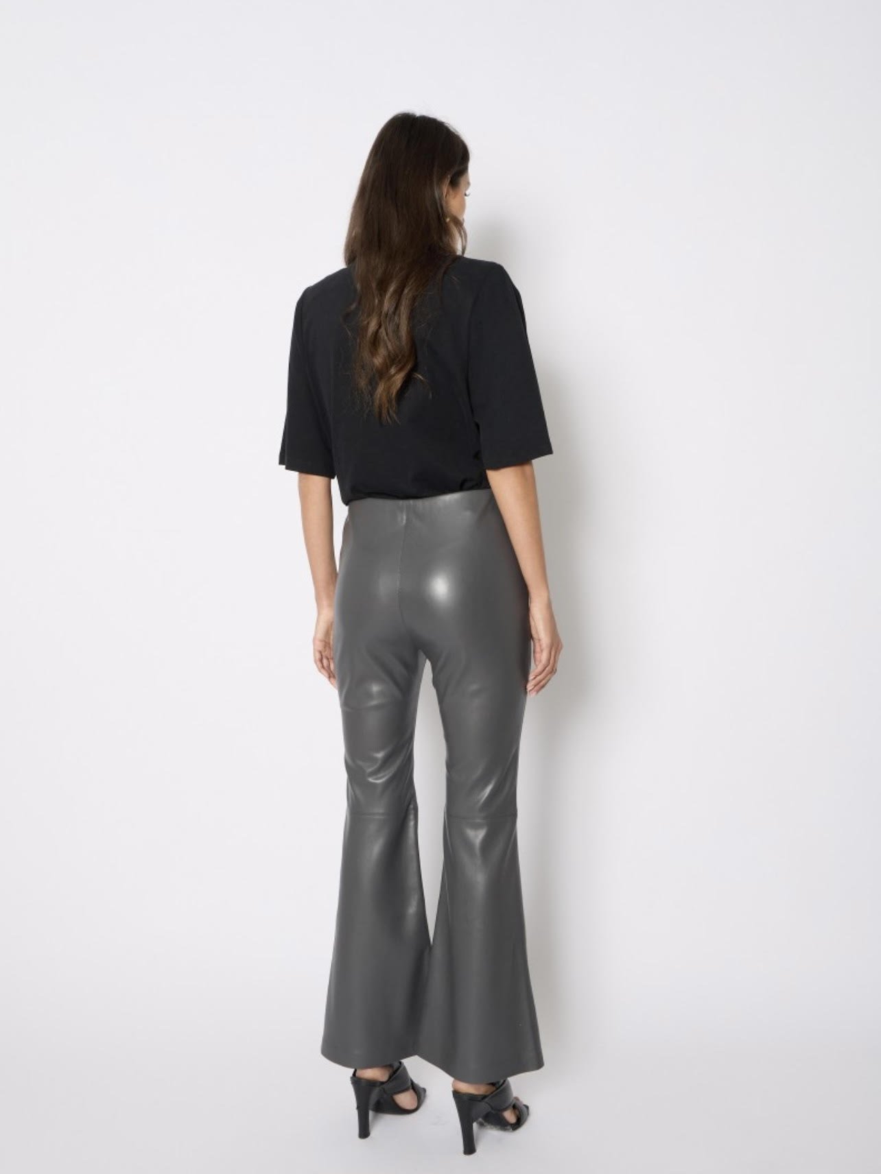 מכנסיים בגוון אפור בגזרה גבוהה עם רגל מתרחבת עשויים בד דמוי עור איכותי. מראה אלגנטי וסופר שייקי עם קו תפר באזור הברך שמעניק תחושת מבנה מושלם.