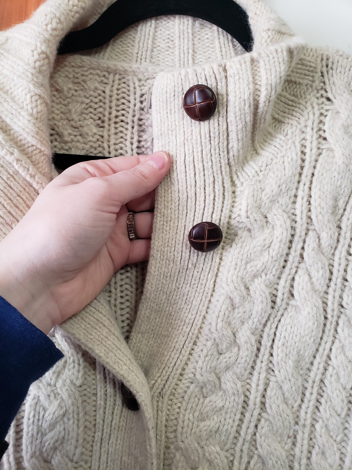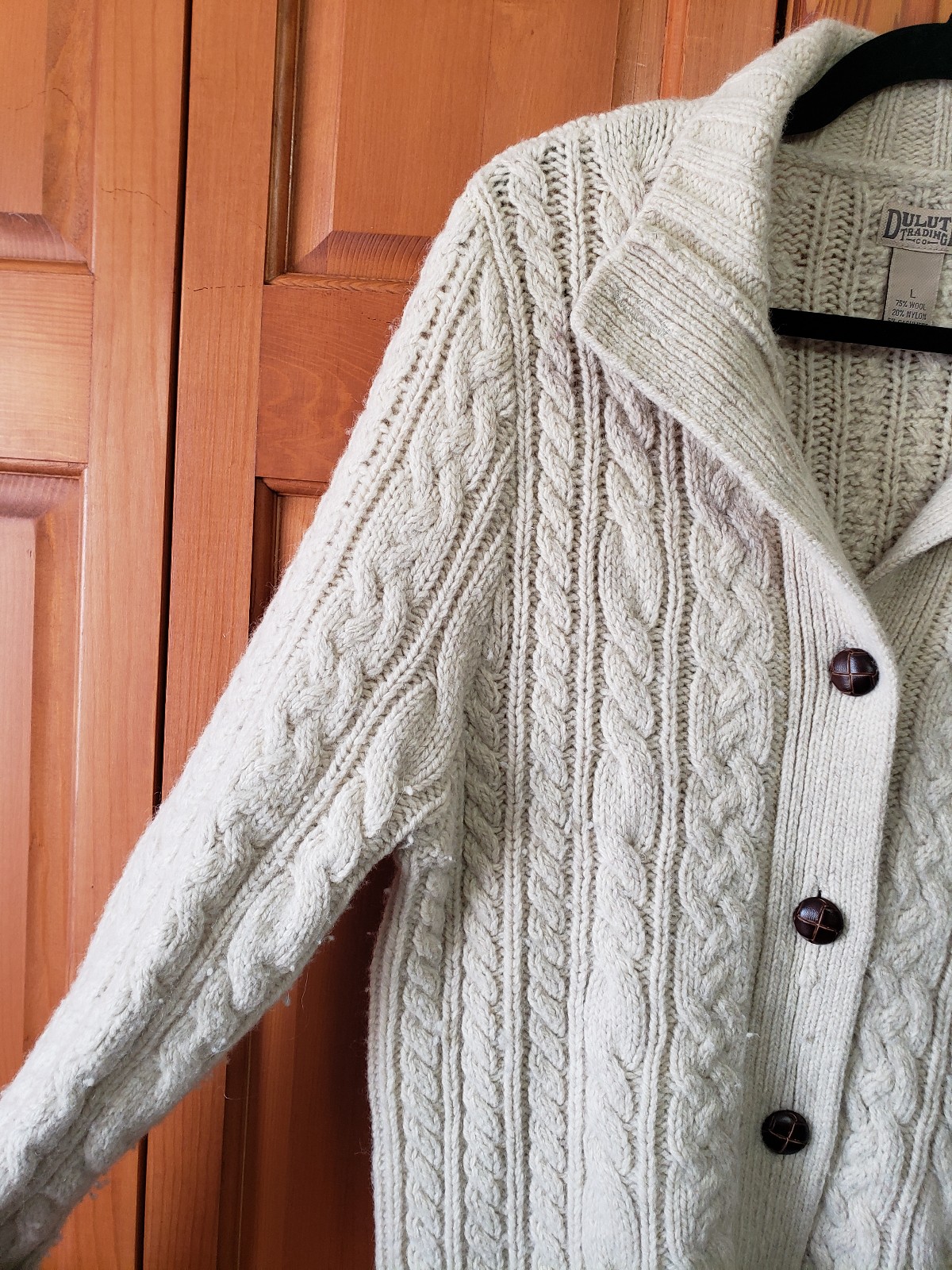 ivory cream off white oat natural color fiber textured woven knit cable ribbed name brand designer quality style stylish fashion fashionable high end quality materials outdoor outdoors company tunic button up down sweater cardigan pull over jacket winter fall autumn season barn activities riding chores farmhouse boho