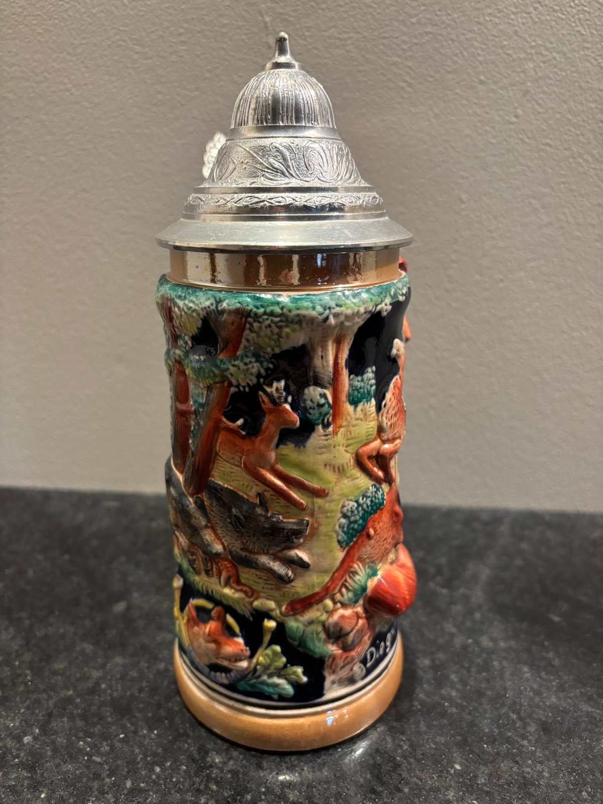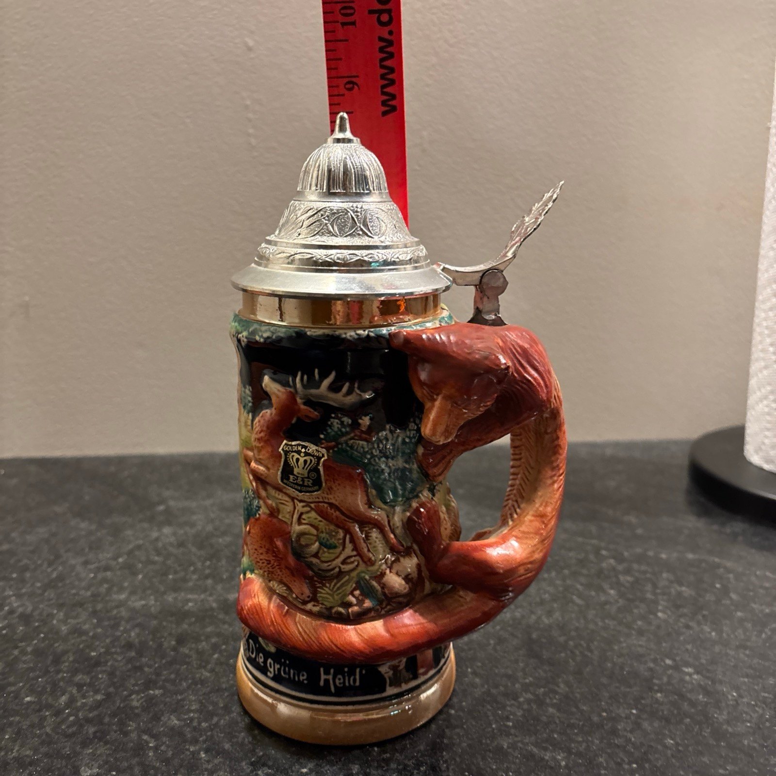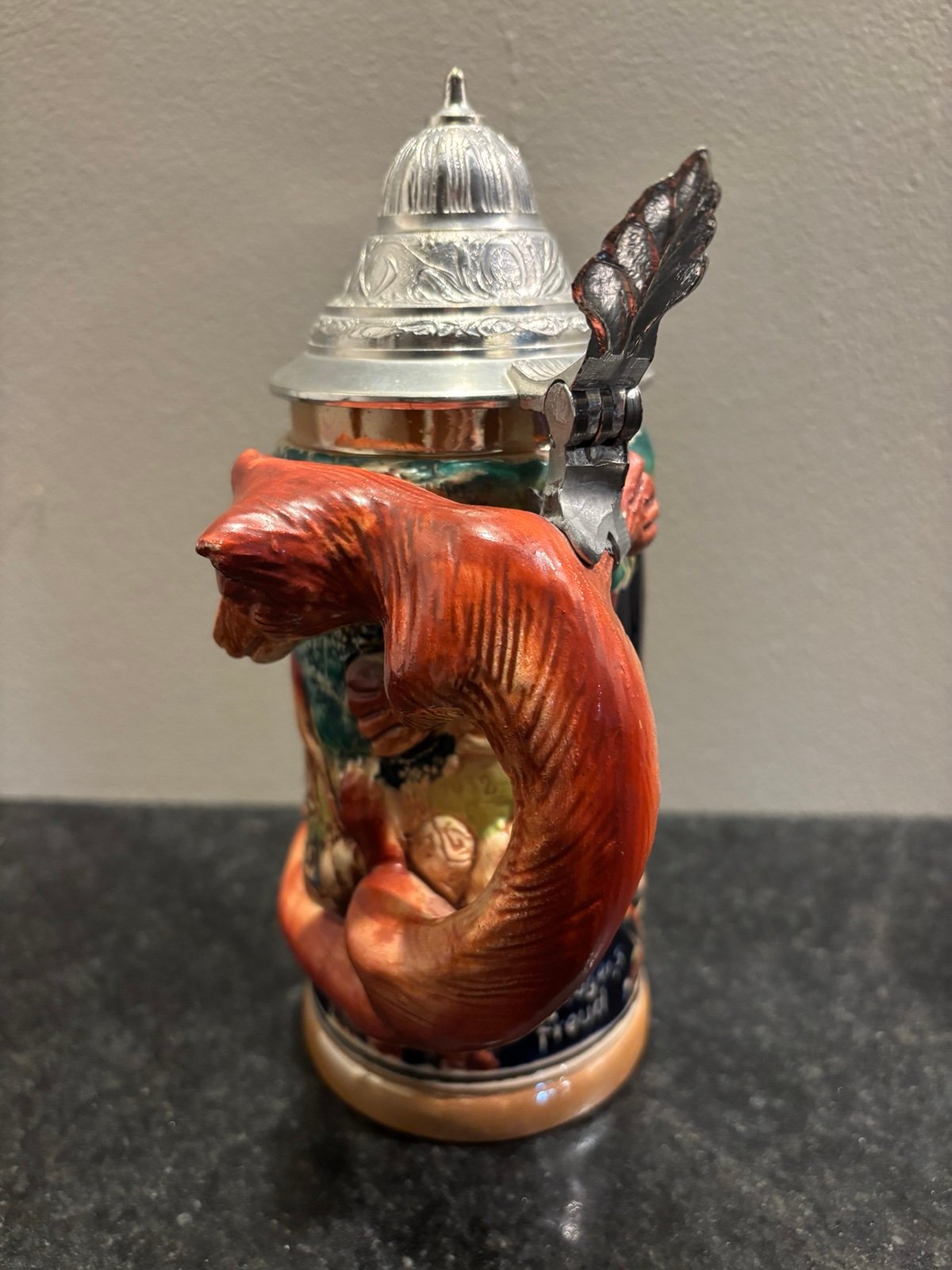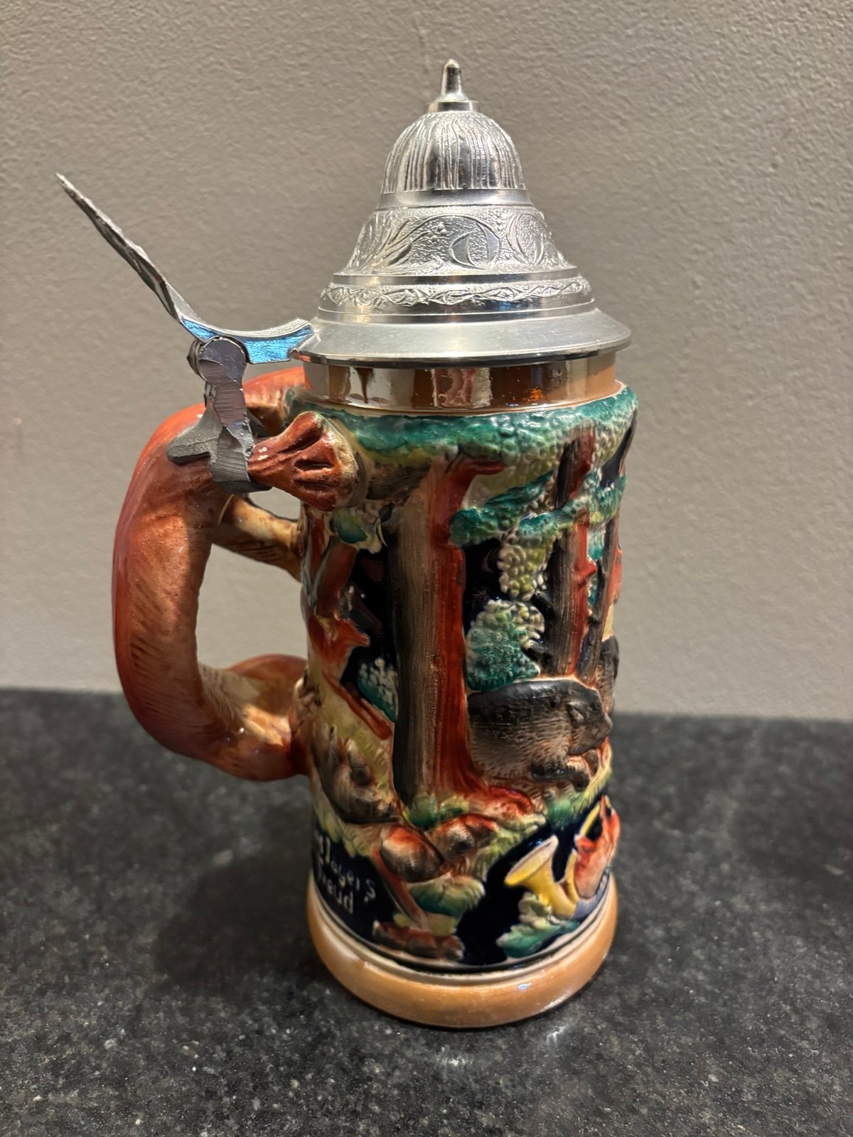 The German Fox Handle Huntsman Lidded Beer Stein is a unique and collectible piece of drinkware handmade in Germany. This stein features a distinctive fox handle design, adding a touch of charm to its breweriana theme. Crafted in Germany, this lidded stein showcases traditional craftsmanship and attention to detail, making it a sought-after item for beer enthusiasts and collectors alike.